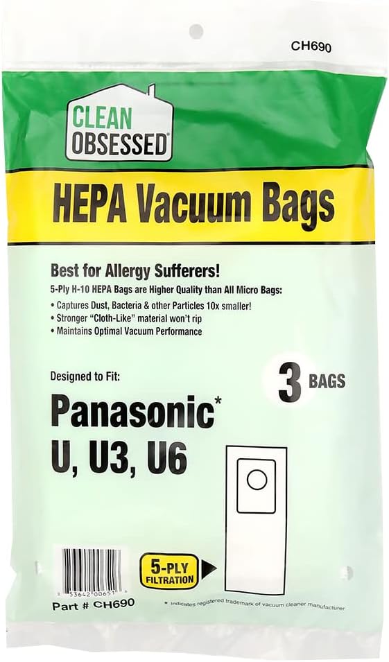 Enhance your vacuuming with Clean Obsessed H-10 HEPA Bags, designed to fit Panasonic U, U3, and U6 models. This pack of 3 bags provides high-efficiency filtration, capturing fine dust, allergens, and debris to improve air quality and vacuum performance. Each bag is built for durability and effectiveness, helping to extend the life of your vacuum cleaner. Maintain a cleaner, healthier environment with these reliable HEPA bags, ensuring consistent and superior results with every use.