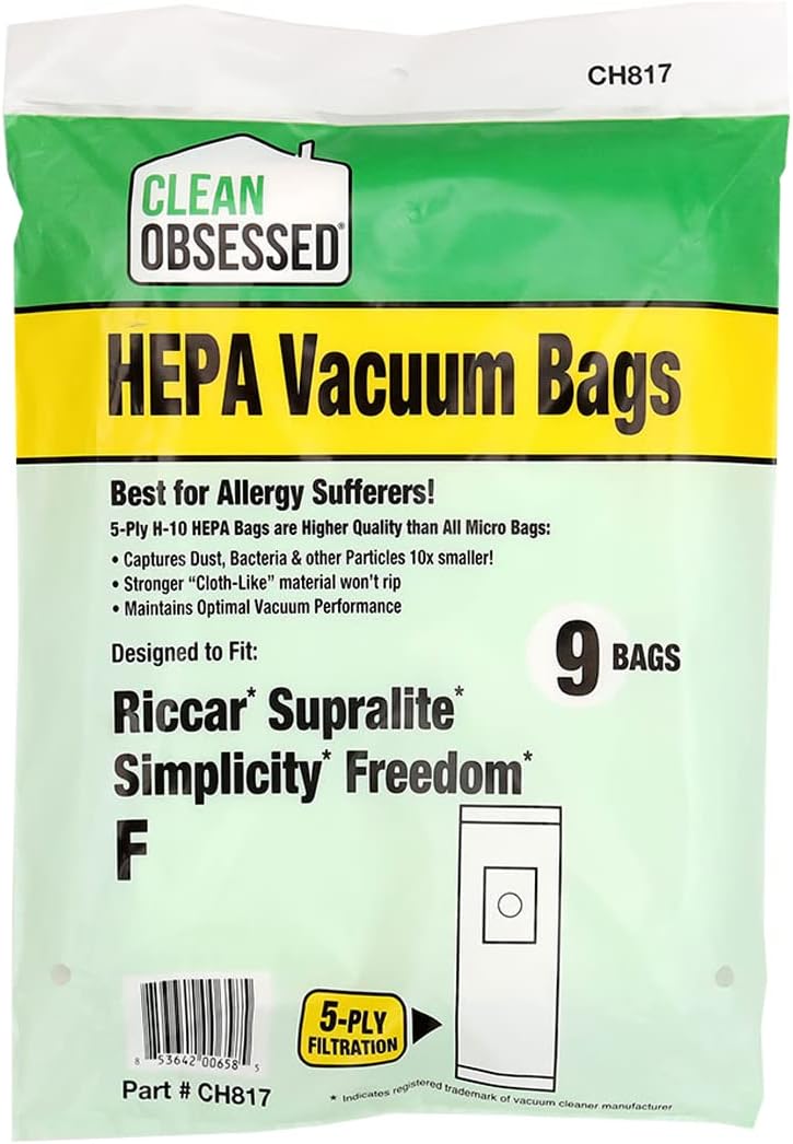 CLEAN OBSESSED H-10 HEPA VACUUM BAGS FITS RICCAR SUPRALITE & SIMPLICITY FREEDOM TYPE F, PACK OF 9